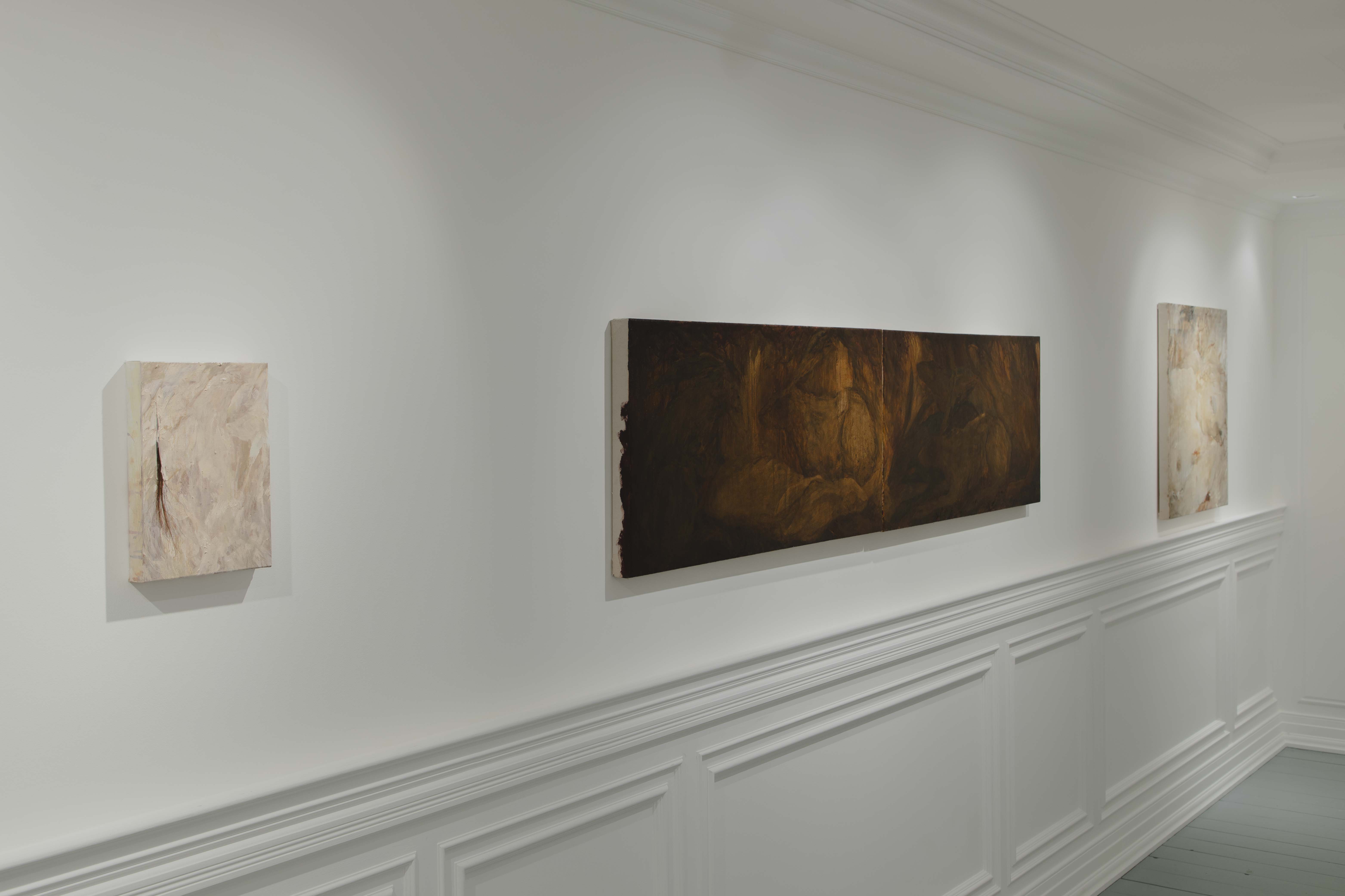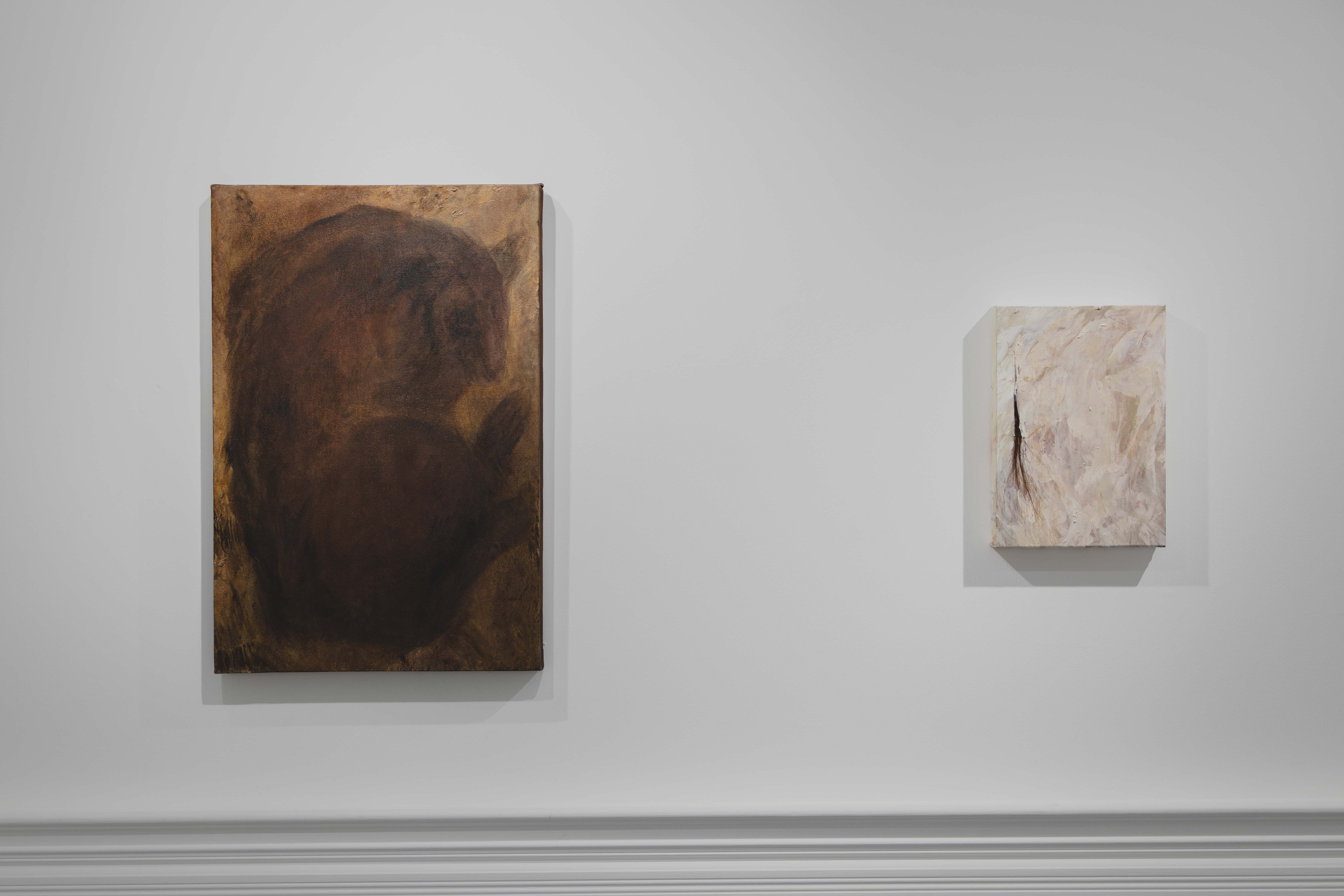 Installation view, (Left) Sanctuary, Oil & Bleach on Canvas, 40 x 60cm, 2022 (Right) Split Ends, Oil & Hair on Canvas, 21 x 30cm, 2023